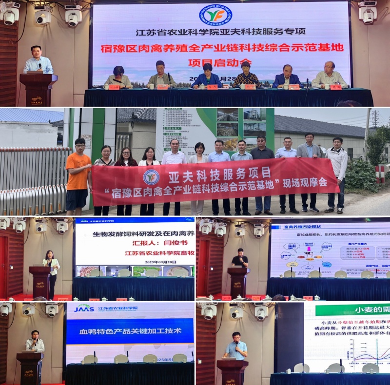 9月28日,由畜牧研究所牵头的2025年度江苏省农业科学院亚夫科技服务项目“宿豫区肉禽全产业链科技综合示范基地”项目启动会暨技术培训会在宿迁顺利召开。我院副院长、党委委员王冉,宿迁市农业农村局副局长马俊斌,宿迁市宿豫区副区长彭敏出席并讲话。院成果转化处处长顾军,宿迁农科所所长刘新,宿迁市畜牧兽医站、宿豫区农业农村局、肉禽养殖企业和种植大户、项目团队核心成员及农技骨干共100余人参加会议。会议由畜牧所所长叶小梅主持。