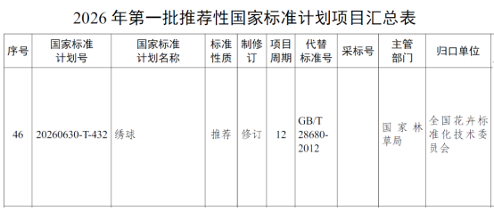1月28日,国家标准化管理委员会发布通知,下达2026年第一批推荐性国家标准制修订计划,《绣球》获批立项(项目编号:20...