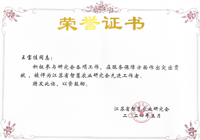 会议对优秀会员单位和个人进行表彰,我院获评“优秀会员单位”,智慧农业创新团队成员王宝佳获评“先进工作者”。