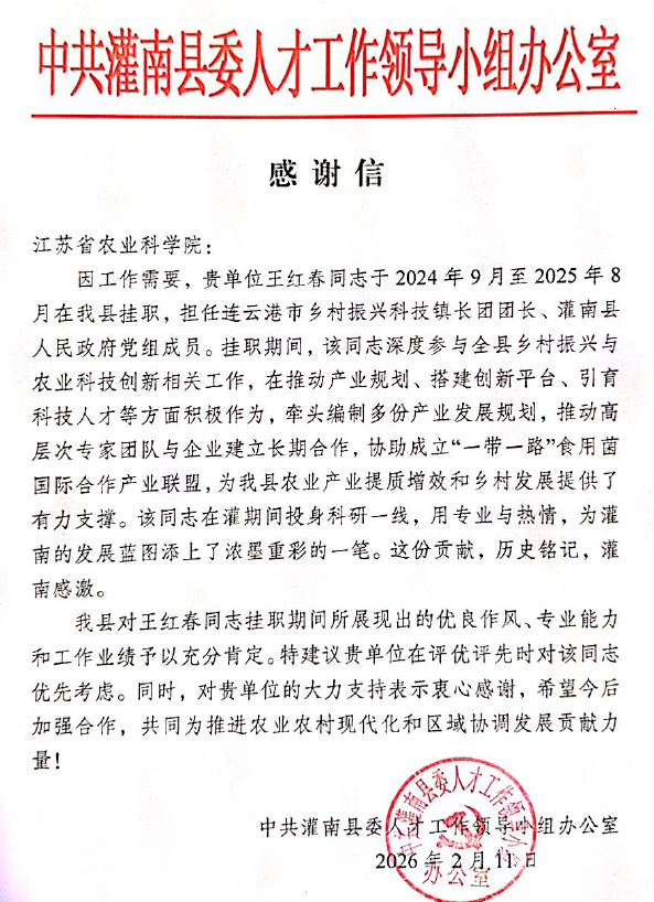 日前,灌南县人民政府致信我院植保所,感谢植保所副所长王红春在挂职期间付出的辛勤努力、作出的积极贡献,予以充分肯定并致以诚挚感谢。因工作需要,王红春同志于2024年9月至2025年8月在灌南县挂职,担任连云港市乡村振兴科技镇长团团长、灌南县人民政府党组成员。挂职期间,该同志深度参与全县乡村振兴与农业科技创新工作,在推动产业规划、搭建创新平台、引育科技人才等方面积极作为,牵头编制多份产业发展规划,推动高层次专家团队与企业建立长期合作,协助成立“一带一路”食用菌国际合作产业联盟,为灌南县农业产业提质增效和乡村发展提供了有力支撑。
