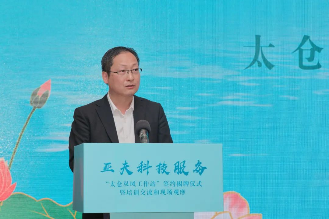江苏太湖地区农业科学研究所、太仓市双凤镇人民政府、太仓市农业农村局签订了三方共建协议。赵亚夫先生、孙洪武副院长、盛海峰副市长、姜红卫所长和陈凯镇长共同为“江苏省农业科学院亚夫科技服务太仓双凤工作站”揭牌。
