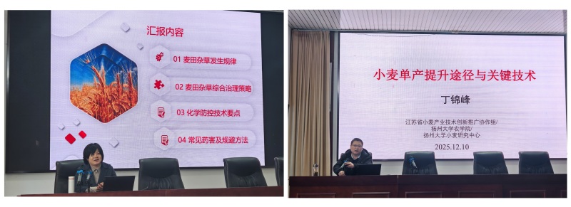 扬州大学农学院教授丁锦峰围绕“小麦单产提升途径与关键技术”作专题授课。他系统阐述了以“培育壮苗、壮根壮秆、延缓衰老”为核心的稻茬小麦高产路径,强调前期培育壮苗是确保足穗的基础,中期健壮茎秆有利于形成大穗,后期灌浆管理是提高粒重的关键。丁教授重点讲解了稻茬小麦机播壮苗技术,涵盖适期适量播种、高质量耕整播种以及高效播种机具的应用,为实现一播全苗、培育匀苗壮苗提供了扎实的技术方案。此外,他还详细介绍了冬前“五查一促”田间管理措施,包括查漏补缺、清沟降渍、补水抗旱、补肥促蘖和除草控草,强调通过精细化田间管理促进苗情转化,为小麦安全越冬和高产稳产奠定坚实基础。