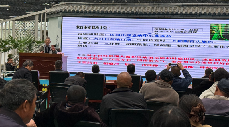 培训会上,项目负责人樊磊研究员首先介绍了亚夫精神和本项目实施全程绿色防控技术的关键节点及其采取的具体措施。随后,陈夕军教授和植保所张志春副研究员分别以虫水稻主要病害和虫害防控的角度,结合水稻主要病害的危害症状及科学防治措施”和水稻主要虫害的发生、危害症状及绿色防控产品和技术,作了专业技术培训教学。