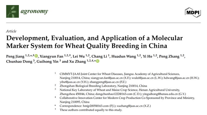 近日,粮作所小麦遗传育种团队在国际期刊《Agronomy》发表了关于小麦品质分子标记选择体系(Quality Molecular Marker Selection System,QMMS)的研究成果(DOI: 10.3390/agronomy15112494)。团队通过整合前期籽粒蛋白质含量、籽粒硬度、高分子量麦谷蛋白亚基等核心品质性状相关研究结果,成功构建小麦QMMS,以约 5 元 / 样本的低成本、高通量优势,破解传统品质育种盲目低效的难题,为我国专用小麦精准培育提供关键技术支撑。该研究得到河南农业大学、扬州大学、江苏里下河地区农业科学研究所、江苏省镇江市农业科学院、江苏瑞华农业科技有限公司等单位的大力支持。
