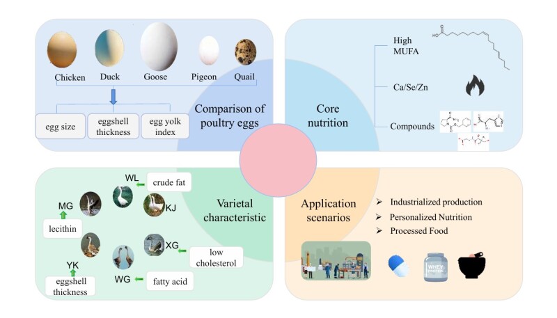 目前,关于鹅蛋的研究集中在繁育和孵化方面,特征品质尚不清楚。本研究以6种地理标志产品鹅蛋(马冈肉鹅、开江白鹅、兴国灰鹅、武冈铜鹅、永康灰鹅、莱阳五龙鹅)为研究对象,构建外观品质、基础营养品质和活性功能物质的多维品质指纹图谱,揭示和评价了鹅蛋品质特征。与鸡鸭蛋相比,鹅蛋在感官品质上表现为蛋壳更厚、蛋黄指数更高,适合长距离运输;营养成分上,鹅蛋富含对心血管健康有益的单不饱和脂肪酸,蛋白质易于吸收且氨基酸评分高,属于优质蛋白来源;鹅蛋富含卵磷脂、钙、锌、硒、组氨酸、L-脯氨酸、N-乙酰-D-氨基葡萄糖和泛酸等多种功能物质,提升免疫力和骨骼健康。于特殊消费群体而言,兴国灰鹅蛋胆固醇低,武冈铜鹅油酸含量高,更有利于心血管健康。生产上兴国灰鹅蛋蛋黄指数高、蛋黄色泽鲜亮,具备更强的市场竞争力;马冈鹅蛋卵磷脂含量突出,适用于蛋品深加工。这些独特品质的形成受到鹅品种、饲料及养殖模式等因素的影响。基于上述发现,研究提出了建设性的生产策略,优化脂肪酸组成、富集微量元素及小分子功能物质,为提升地标产品品质和附加值提供了科学依据。研究将原本笼统的“鹅蛋”概念细化为一组独具特色的营养载体,为“吃得好、吃得准”的现代消费需求提供了重要的科学支撑。