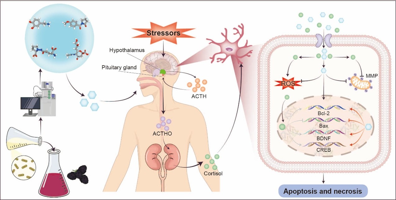神经元损伤及凋亡是多种精神障碍与神经退行性疾病发生的关键环节,其中下丘脑-垂体-肾上腺(HPA)轴过度激活导致糖皮质激素水平升高是主要诱因。利用益生菌进行生物加工,可以通过转化食物基质释放或生成新的生物活性物质,直接或间接发挥宿主健康效应,已成为营养功能农产品开发的前沿手段。该研究基于自主构建的益生菌资源挖掘与功能评价体系,筛选出具有突出神经保护功能的专利菌株副干酪乳酪杆菌Lacticaseibacillus paracasei PC18,系统揭示了其缓解皮质酮诱导的神经元损伤的分子机制。研究表明,该菌株能够高效利用黑莓等特色农产品,使其显著提高损伤神经元的线粒体膜电位、减轻氧化应激与细胞凋亡,并从蛋白与基因表达层面揭示了Bax/Bcl-2凋亡通路与CREB/BDNF神经保护通路是该行为实现的重要路径。进一步地,基因组学和代谢组学分析发现,菌株通过原位合成或生物转化富集了多种具有神经活性的代谢产物,包括氨基酸、肽类及其衍生物、吲哚衍生物、酚酸类等,相关合成转化途径主要涉及代谢、人类疾病及环境信息处理等关键通路,其中以氨基酸代谢、核苷酸代谢和膜转运为发挥核心作用的具体途径。