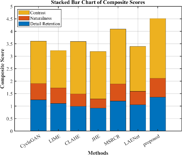 图3 不同增强方法性能的综合分析,(a)不同方法的雷达图,(b)不同方法的堆积条形图。