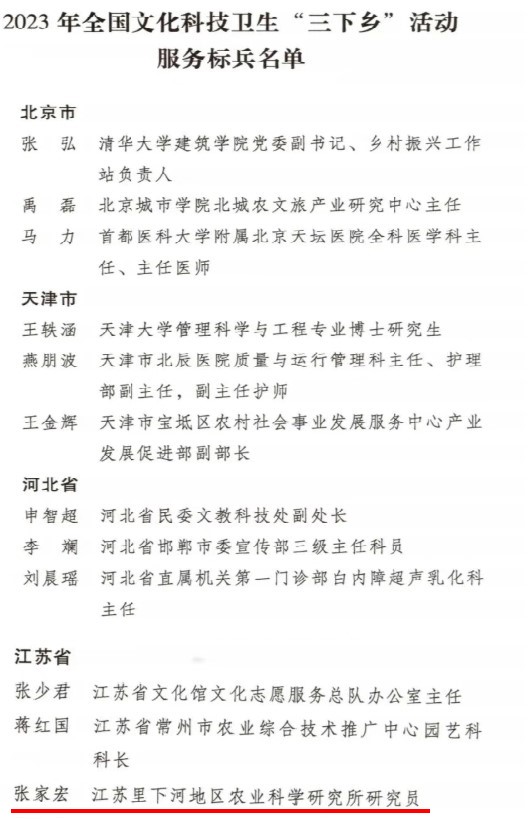 里下河所张家宏研究员获全国文化科技卫生“三下乡”活动服务标兵称号