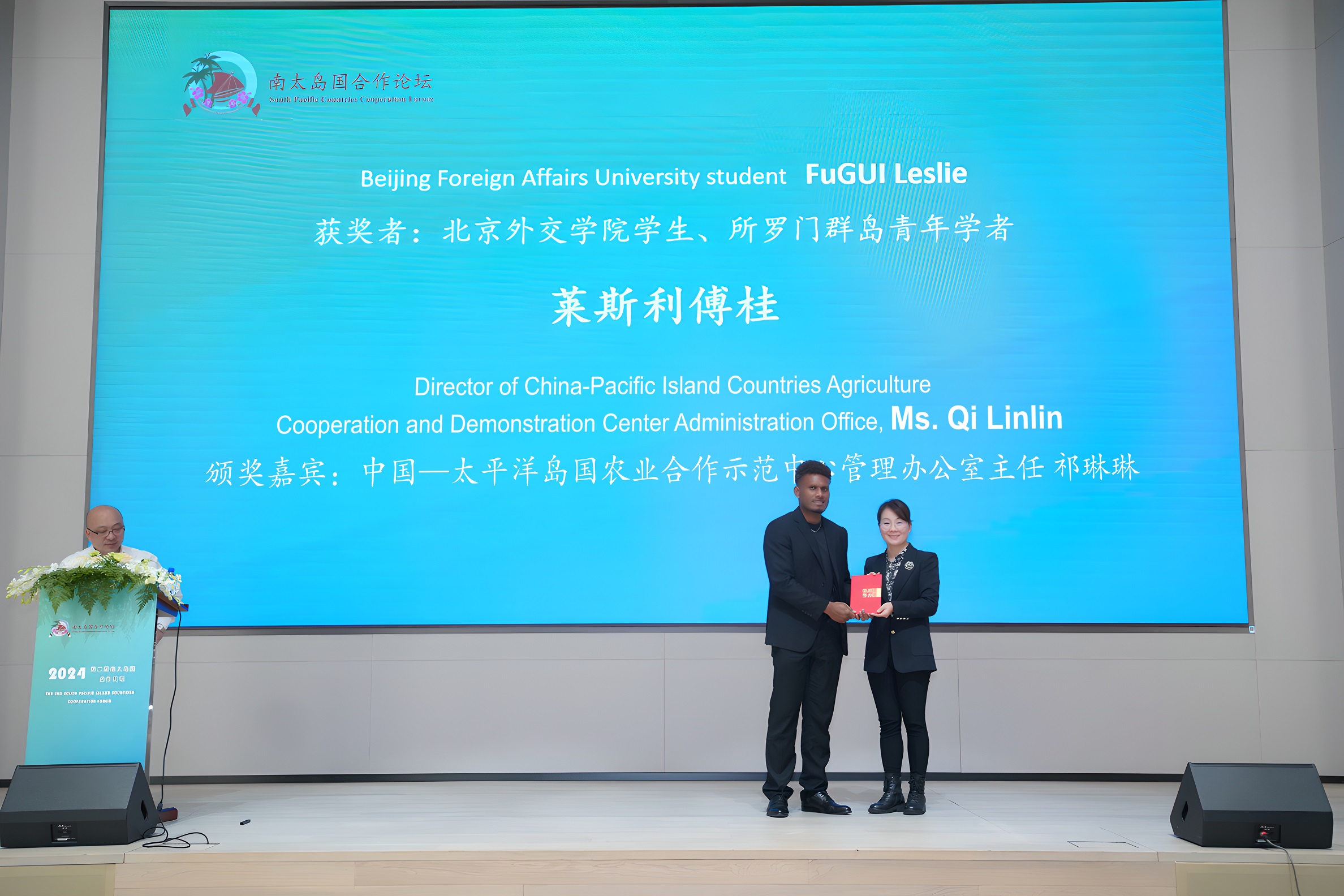 会议还举行了突出贡献个人与机构表彰仪式。祁琳琳应邀为所罗门群岛青年学者莱斯利傅桂颁奖,鼓励其为中国与所罗门群岛开展合作做出的贡献。