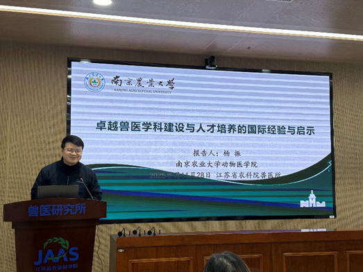本次论坛特邀南京农业大学杨振副教授担任主讲嘉宾,他以“卓越兽医学科建设与人才培养的国际经验与启示”为主题,系统介绍了美国兽医学院的发展历程与学科建设特点,深入剖析了其兽医学博士(DVM)培养模式的核心理念与具体实践。他结合自身经历,分享了归国DVM学者在推动国内兽医教育改革中的探索与成果,并从课程设计、临床能力培养、科研创新等多角度阐述了如何融合国际经验与本土实际需求。在谈及我国兽医学科与教育未来发展方向时,杨振指出,需进一步优化学科布局,加强产学研协同,注重临床实践与科研能力并重,同时推动国际化合作与人才交流,为我国兽医事业的高质量发展注入持续动力。现场互动环节气氛热烈,青年科研人员就兽医教育模式、职业发展路径等话题与杨老师进行了深入交流。