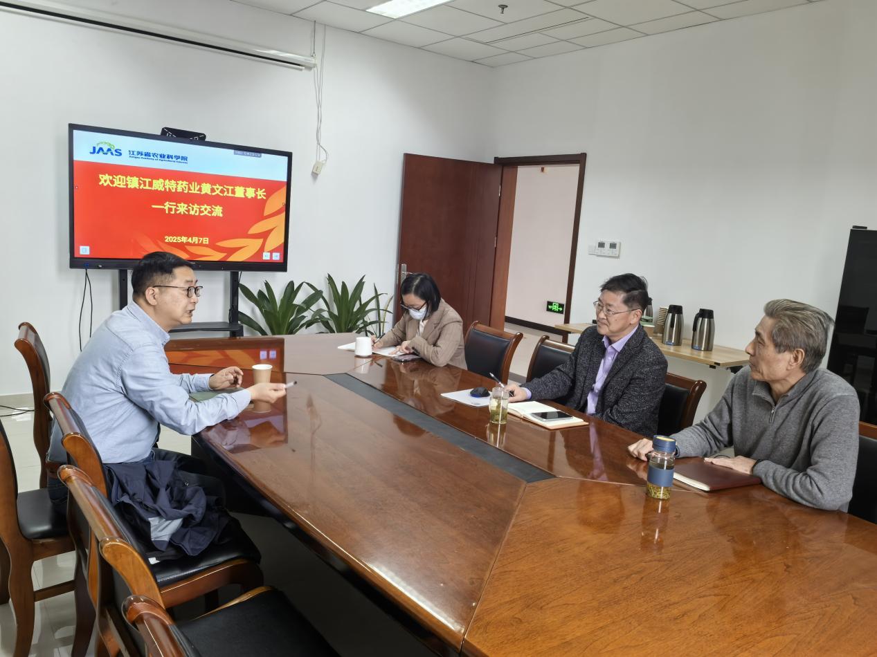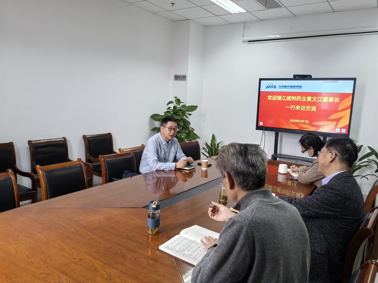 4月7日,镇江威特药业董事长、江苏省兽药协会会长黄文江来我院兽医所调研交流。兽医所党总支书记陈晓强主持接待,副所长宋艳华、省畜牧兽医学会秘书长张则斌及宠物团队科技骨干参加。