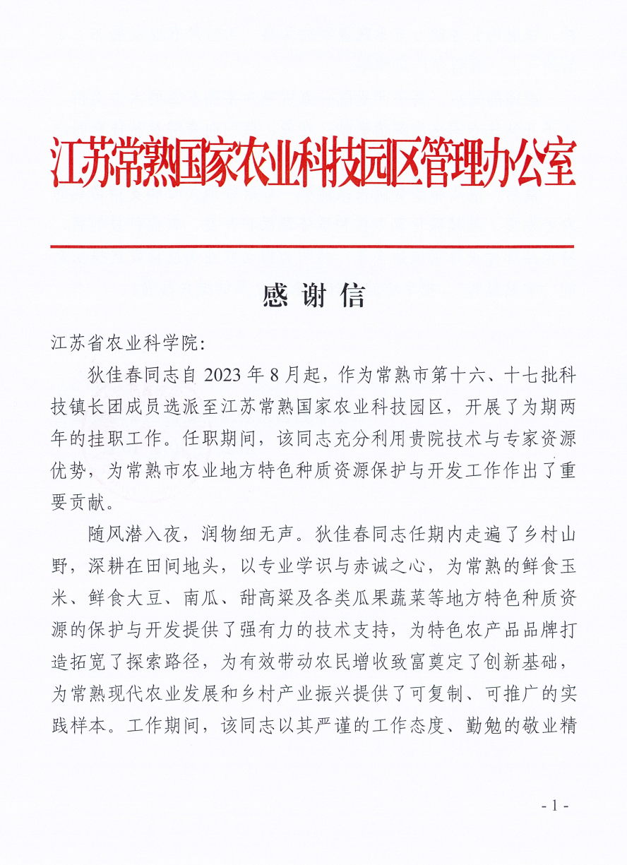 近日,江苏常熟国家农业科技园区管理办公室致信我院,对我院资源所种质资源保护团队狄佳春同志在挂职期间,为常熟市农业地方特色种质资源保护与开发、现代农业发展及乡村产业振兴做出的贡献表示感谢。