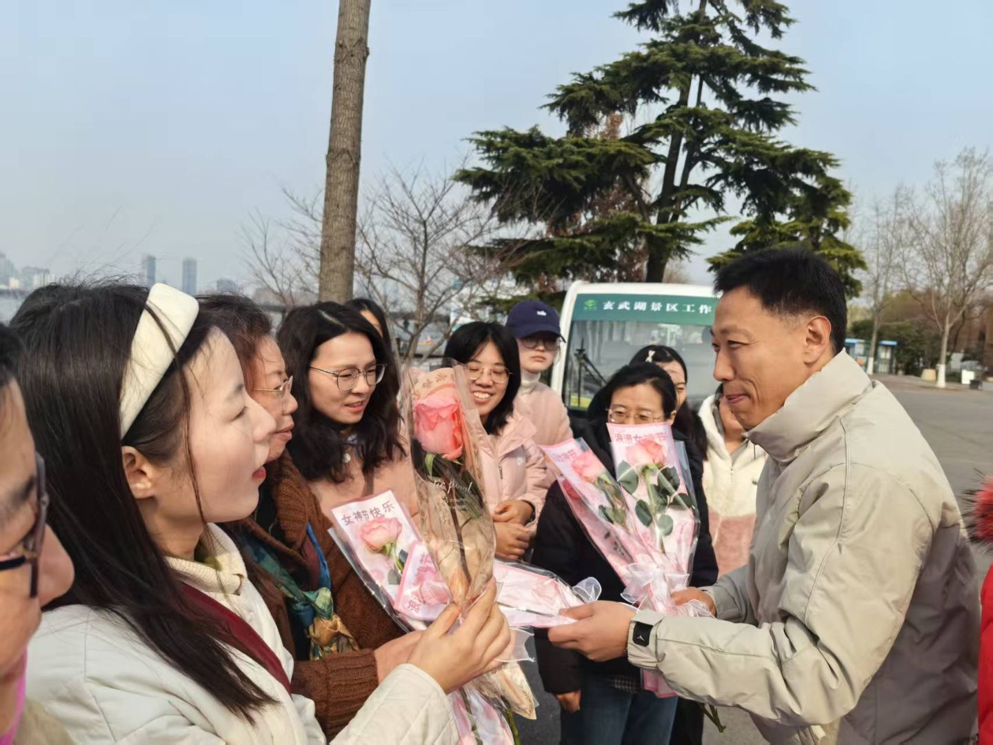 活动当天,阳光明媚,春风和煦。女职工们早早来到玄武湖集合,现场气氛热烈而温馨。活动伊始,所工会主席王宁副所长与工会副主席邬义波亲自为每一位女职工献上鲜花,表达了对她们节日的美好祝福和诚挚敬意。娇艳的花朵映衬着女职工们灿烂的笑容,随后大家进行了集体合影,将这一美好的瞬间定格。