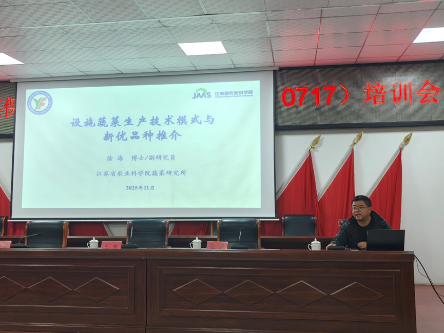 培训会上,徐州所樊继德研究员和蔬菜所徐海副研究员分别围绕“大蒜产业及当前管理技术纪要”和“设施蔬菜新优品种与生产技术集成”作专题讲座。樊继德研究员围绕徐州地区大蒜产业发展现状、市场趋势及高效栽培技术展开深入讲解,并结合房村镇土壤条件和气候特点,进行了细致的技术指导,为蒜农稳产增收提供了科学方案。徐海副研究员详细介绍了适合本地设施栽培的果菜类蔬菜新优品种的特征特性、抗逆性、产量表现及配套栽培要点,他强调,选择优良品种是提升蔬菜品质和效益的基础,鼓励广大种植户积极尝试新品种、新模式,拓宽增收渠道。