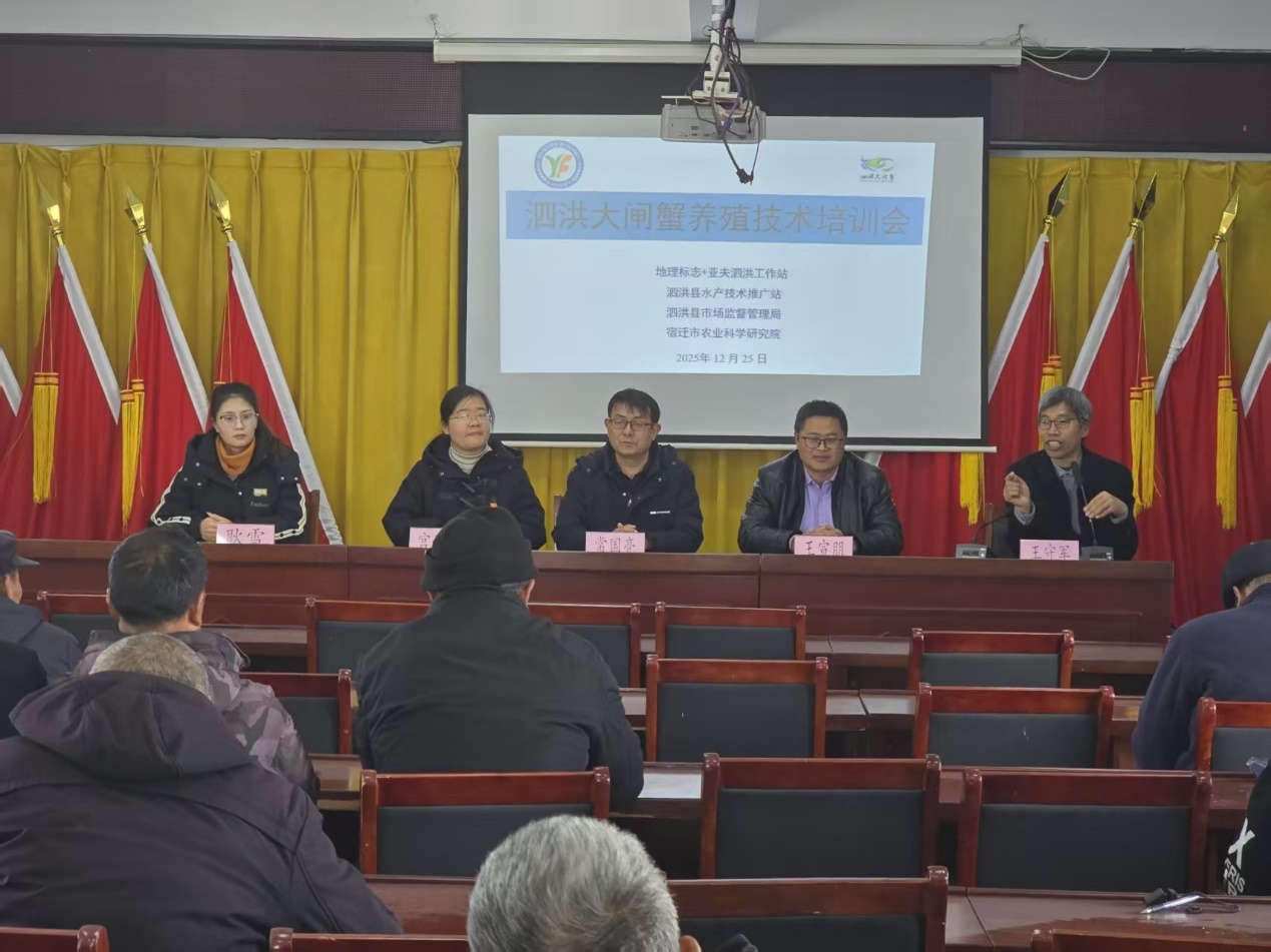 为进一步提高地理标志+亚夫泗洪工作站的服务成效,提升养殖户的技术水平,促进"泗洪大闸蟹"地理标志品牌普及,12月25日,工作站联合泗洪县水产技术推广站,在天岗湖乡举办大闸蟹养殖技术专题培训会,乡镇渔技人员、河蟹养殖户代表等60人参加。