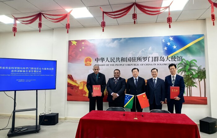 访问所罗门群岛期间,在江苏省副省长方伟、中国驻所罗门群岛大使蔡蔚鸣、所罗门群岛农业与畜牧部部长弗兰克林·德雷克·瓦西的见证下,王克华代表我院与所罗门群岛农业与畜牧部签署合作谅解备忘录,推动双方在共建农业示范基地、培养农业人才、开展联合研究等领域的合作。
