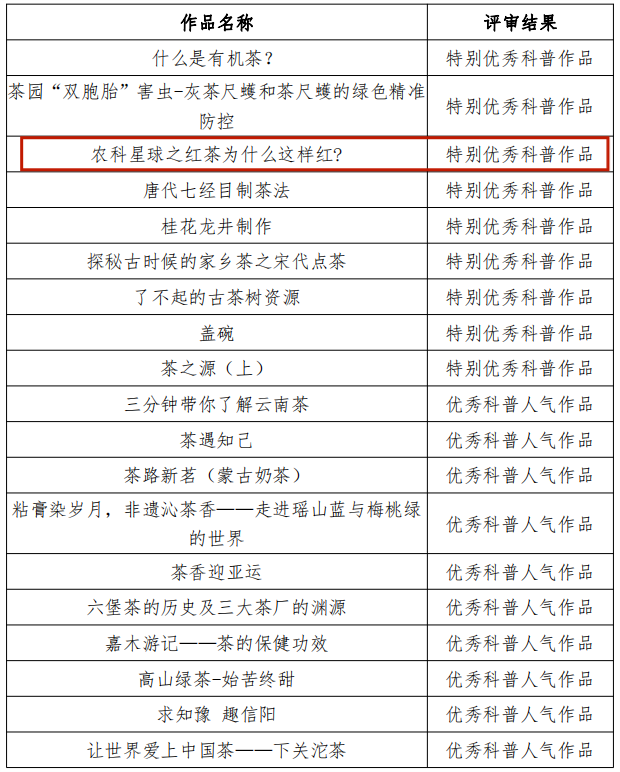 近日,中国茶叶学会公布“让世界爱上中国茶”科普短视频及科普图文征集作品评审结果,我院原创科普动画“农科星球”之《红茶为什么这样红?》被评为“特别优秀科普作品”。