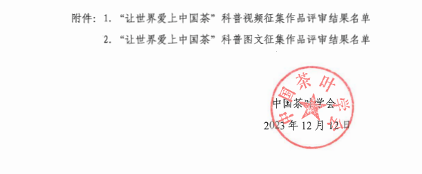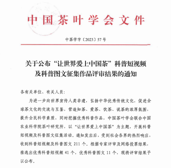 此次征集活动是由中国茶叶学会联合中国农业科学院茶叶研究所共同发起,面向国内外共征集211份科普短视频及科普图文作品,根据专家评审及网络投票结果,共选出优秀科普短视频41个、优秀科普图文11个。其中,9个科普短视频作品获评“特别优秀科普作品”。