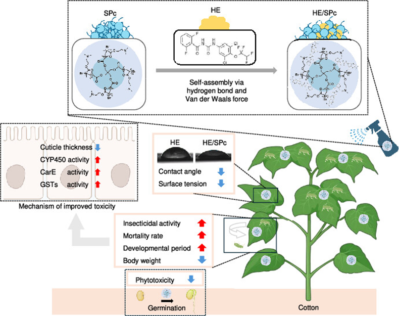 2、团队构建了基于星状阳离子聚合物 (SPc) 的氟铃脲 (HE) 纳米递送系统,该复合物通过氢键与范德华力实现自组装,将HE粒径从751.21 nm显著降低至174.62 nm,从而大幅提升其在叶面的润湿性、附着性与滞留性能。生测实验表明,HE/SPc对绿盲蝽若虫的LC₅₀值降至4.932 mg/L,杀虫活性活性提升7倍以上。机制研究进一步揭示,HE/SPc能够下调角质蛋白合成相关基因,破坏昆虫表皮结构,导致若虫发育延迟与体重下降。同时,SPc载体还有效降低了HE在作物中的残留,缓解其对豆类种子萌发与幼苗生长的植物毒性。该研究系统阐释了纳米递送系统在提升农药效能与降低环境风险方面的双重优势,为绿色农药的精准设计与农业可持续发展提供了重要技术支撑。研究结果以“Nanodelivery improves insecticidal activity of hexaflumuron against Apolyguslucorum by inhibiting the synthesis of insect cuticle protein”为题发表在《Journal of Agricultural and Food Chemistry》上 (中科院1区TOP期刊,IF5year = 6.4)。硕士研究生江仁宗、徐广春副研究员和博士研究生乔恒为论文并列第一作者,谭永安博士为论文通讯作者,江苏省农业科学院为第一完成单位。肖留斌研究员、赵静副研究员及Texas A&M University的Keyan Zhu-Salzman教授等参与了相关工作。上述研究工作得到了国家自然科学基金(32372631) 和江苏省农业科技自主创新资金[CX(22)2038]等项目的资助。