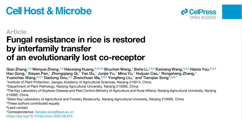 2025年9月17日,江苏省农业科学院植保所水稻病害防控创新团队在国际顶级期刊Cell Host & Microbe(5年影响因子20.5)发表研究论文 “Fungal resistance in rice is restored by interfamily transfer of an evolutionarily lost co-receptor”。该成果首次揭示了模式识别受体PRR跨物种转移面临种间功能限制性屏障(RTF)——单子叶植物因进化丢失PRR的共受体而导致免疫缺陷,并通过跨科转移共受体恢复了水稻对稻曲病和稻瘟病的广谱抗性。这项研究提出了“共受体驱动的跨科免疫”新策略,不仅在基础理论上突破了植物免疫跨物种转移的难题,更为作物病害绿色防控提供了全新解决方案。