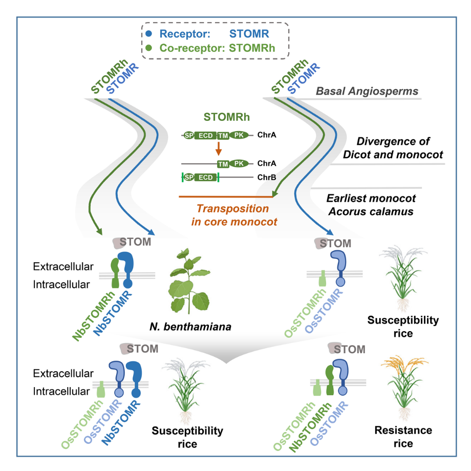 水稻中确实存在与NbSTOMR同源的受体 OsSTOMR,能够结合STOM;但其共受体 OsSTOMRh 在单子叶植物进化过程中经历了转座子介导的染色质重组,胞外结构域被转移至其他染色体上,导致功能丧失。这一“进化缺陷”使得水稻等单子叶作物失去了识别STOM的能力。
