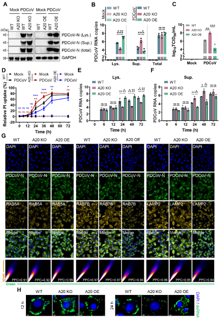 程序性细胞死亡是宿主抵御病毒感染的有效策略。PANoptosis是一种新发现的炎性细胞死亡模式,同时整合了凋亡、焦亡和坏死性凋亡的特征,其核心机制是PANoptosome复合物的动态组装。A20是一种经典的泛素编辑酶,通过其去泛素化活性负调控程序性细胞死亡。但A20是否参与病毒感染诱导的PANoptosis调控,以及在抵御PDCoV释放中的作用,仍有待系统阐明。