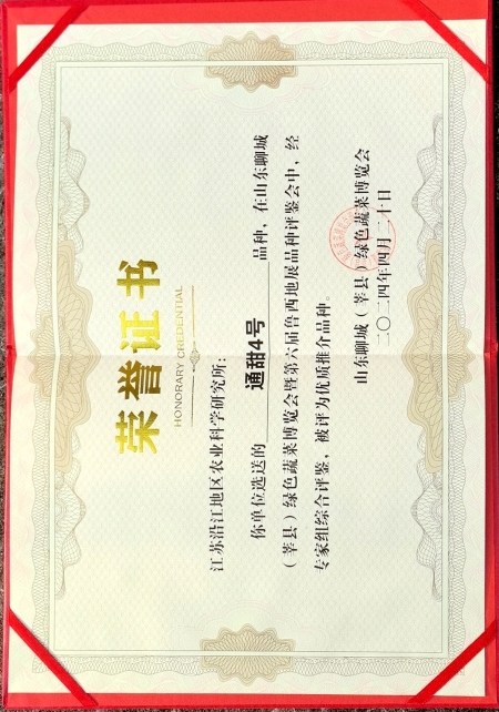 4月26日-28日,2024山东聊城(莘县)绿色蔬菜博览会暨第六届鲁西地展在莘县地展园举行,来自全国各地科研院所、高等院校和种业企业的1482个蔬菜品种参展。专家评审组对参展品种的一致性、抗病性、品质、丰产性、商品性等性状进行现场考察与综合评价,沿江所选育的薄皮甜瓜新品种“通甜4号”获评“优质推介品种”。