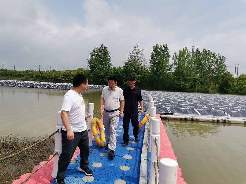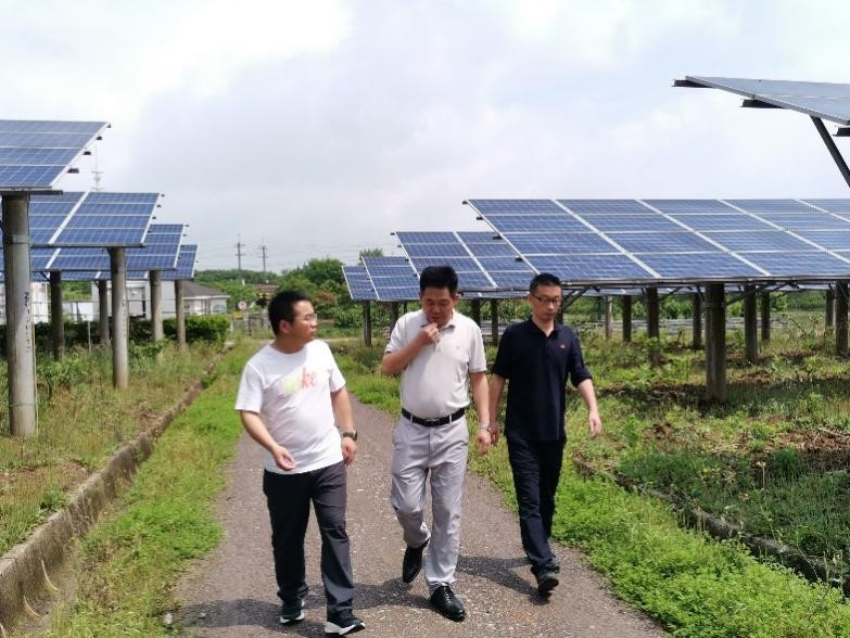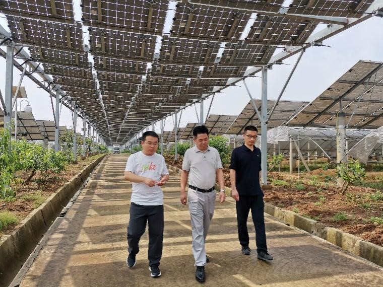 在团队负责人鲍恩财带领下,李明一行实地参观考察了种植团队在南京溧水区农光互补、无锡宜兴渔光互补园区的试验研究现场。在不同园区内,太阳能光伏板分别与农作物种植、畜禽及虾蟹养殖相结合,形成独特的“光伏+农业”模式。李明对种植团队的园区光伏规划设计和研究成果落地给予了高度评价。双方就光伏板下光温分布规律与筛选耐荫作物品种研究进行了探讨,对推广应用光伏农业种植模式达成一致意见。