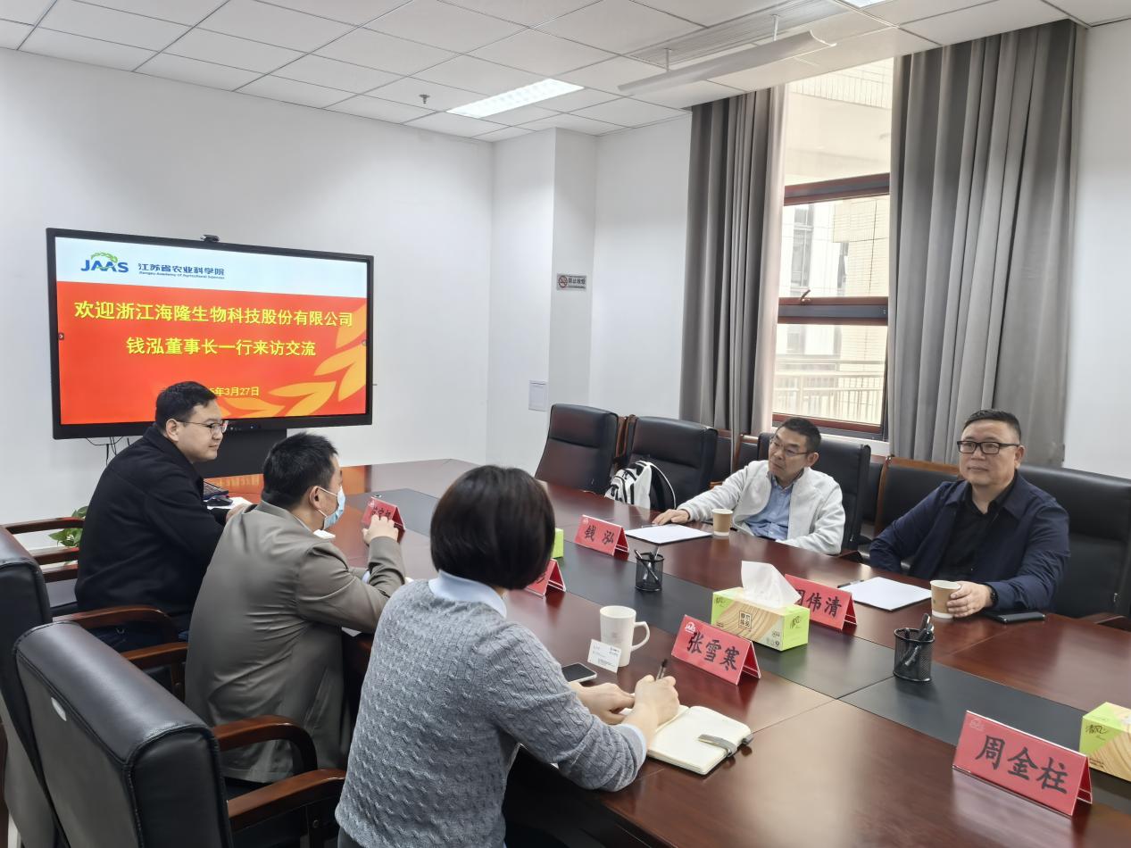 3月27日,浙江海隆生物科技有限公司董事长钱泓、副总经理周伟清来我院兽医所开展调研交流。院科研处处长、兽医所所长李彬主持接待,所党总支书记陈晓强、副所长宋艳华、各创新团队负责人以及动物腹泻病防控团队部分科研骨干共同参加。