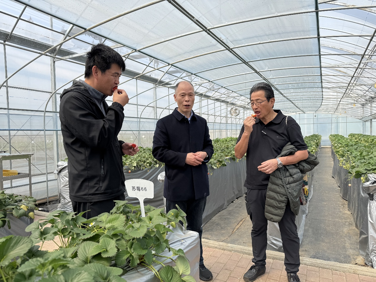 访问期间,丸尾达一行实地走访了国家草莓种质资源圃和新品种试验棚,双方就野生草莓种质资源的收集、保存、利用,以及我院自主选育草莓新品种的特征特性进行了讨论。