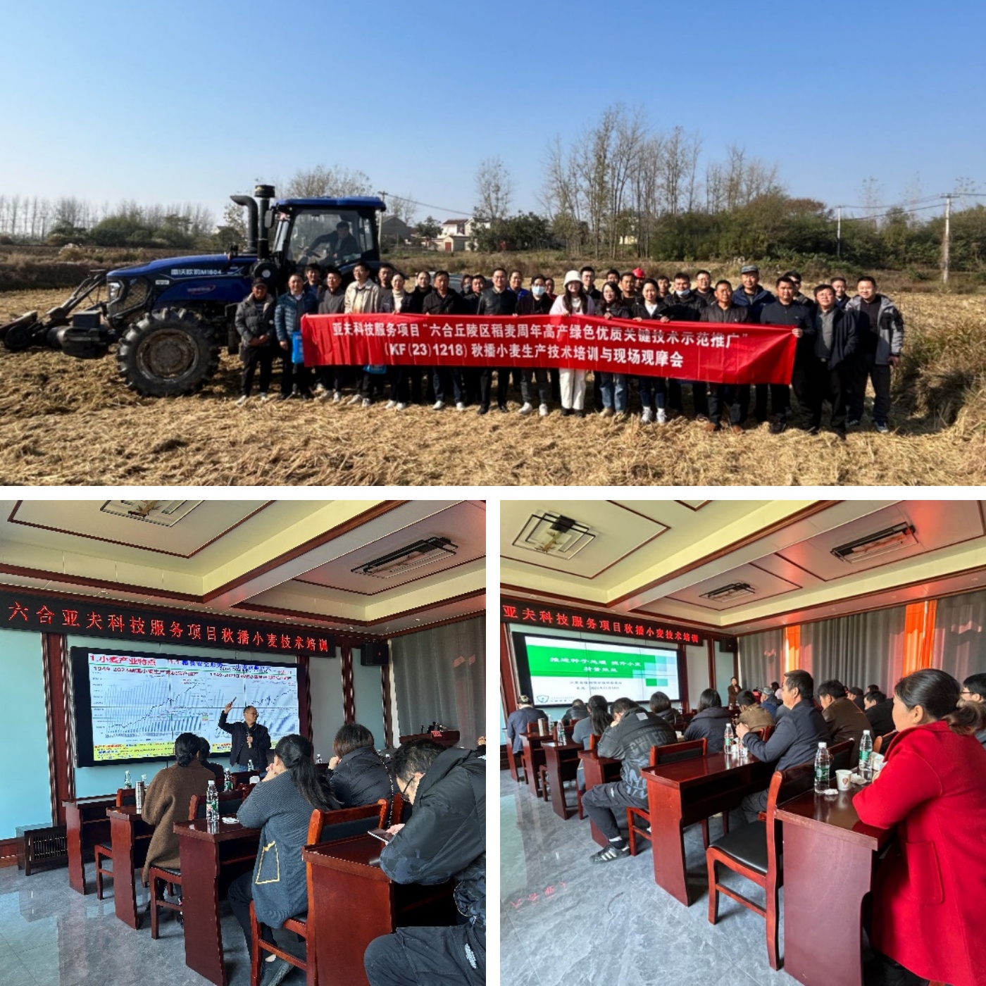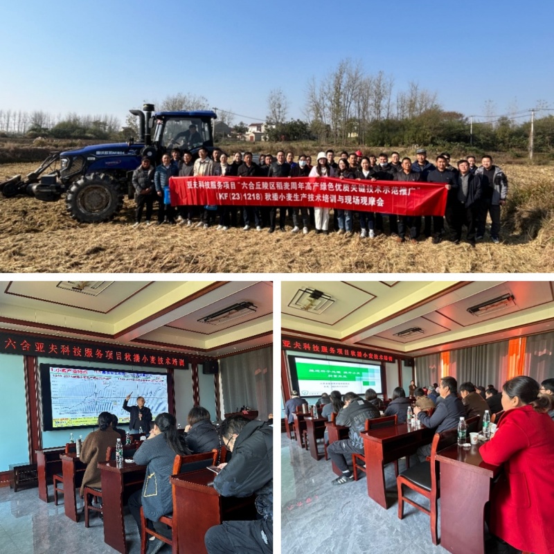为推广小麦绿色优质高产关键技术,提升丘陵区小麦生产水平,11月14日,亚夫科技服务"六合马鞍工作站"联合南京市六合区农技推广中心举办2023年秋播小麦生产技术培训与现场观摩会,邀请省小麦产业技术体系首席专家王龙俊研究员、省植保植检站朱凤研究员进行授课指导。全区种植大户近50人参加了本次培训和现场观摩。