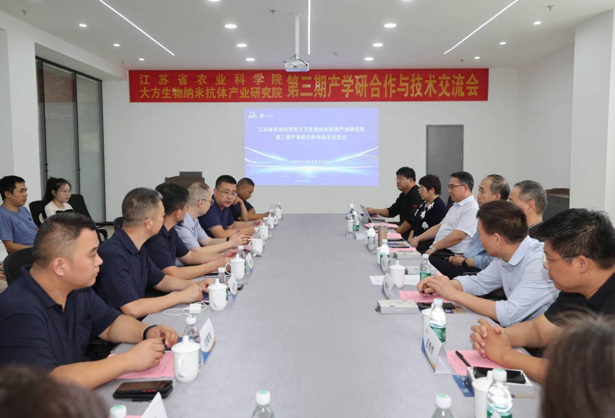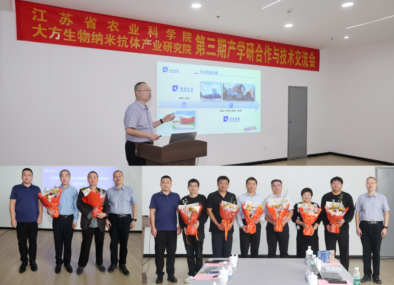 10月18日,江苏省农业科学院大方生物纳米抗体产业研究院(简称研究院)以“基础为本、源头创新、交叉融合”为主题,在江苏泰州召开第三期产学研合作与技术交流会。原军事科学院军事医学研究院军事兽医研究所王兴龙研究员、江苏省农业科学兽医研究所王永山研究员、新疆农垦科学院畜牧兽医研究所薄新文研究员、吉林大学任林柱教授、李金斗博士、中国农业科学院特产研究所杨艳玲研究员、王晓旭副研究员、山东第一医科大学实验动物中心王秀然教授、江苏大方生物工程有限公司董事长刘大方、总经理卞金辉及企业科技人员出席会议。会议由研究院院长钱晶主持。