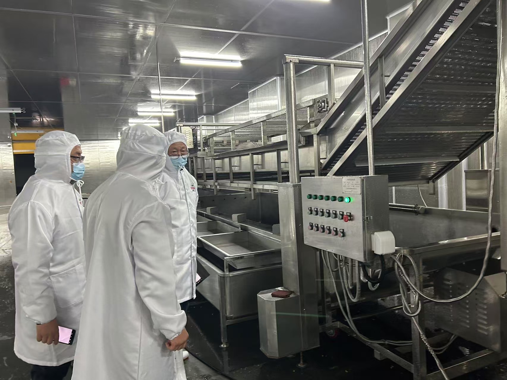 在项目示范基地如东绿海冷冻食品公司,公司生产负责人介绍了新建生产线运行情况。团队专家针对不同品种蔬菜速冻加工过程中关键工艺控制现场给予指导。同时,对生产线设备的卫生管理和日常保养进行了重点提醒。