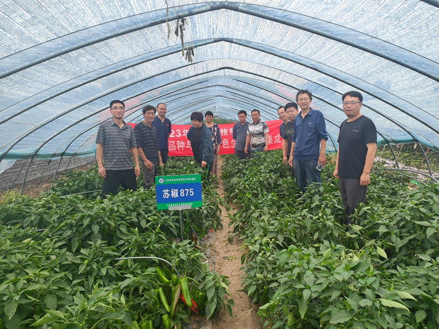 在辣椒核心示范基地,集中展示了团队自主选育的优异新品种,薄皮椒“苏椒629”、“苏椒1614”、“苏椒478”、“春早2号”等品种,牛角椒“苏椒875”、“苏椒876”等品种,以及最新育成的“苏椒QL09”、“苏椒QL52”等辣椒新组合。