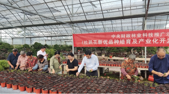 邓衍明等人深入生产一线,精准对接各类技术需求,先后指导了唐硕苗木花卉种植家庭农场、途睿生态农业科技有限公司、苏台花木产业园和春之灼花卉园艺公司木绣球生产基地等多家单位。在唐硕家庭农场,科技人员结合中央财政林业技术推广示范项目《深化集体林权制度改革背景下杜鹃花新优品种培育及产业化开发利用》的实施,重点开展杜鹃扦插育苗技术的培训与指导,针对扦插基质配比、湿度调控、插条选取、插穗修剪及处理等关键技术环节,进行系统讲解与现场示范。在途睿公司多肉植物生产基地,科技人员针对遮阴降温、水分管理及病害防控等管护措施,提出了贴合基地实际的针对性建议。在春之灼木绣球种植基地,科技人员围绕砧木选择、嫁接时机及接后管理等方面开展技术指导,助力企业提升嫁接成活率与苗木质量。