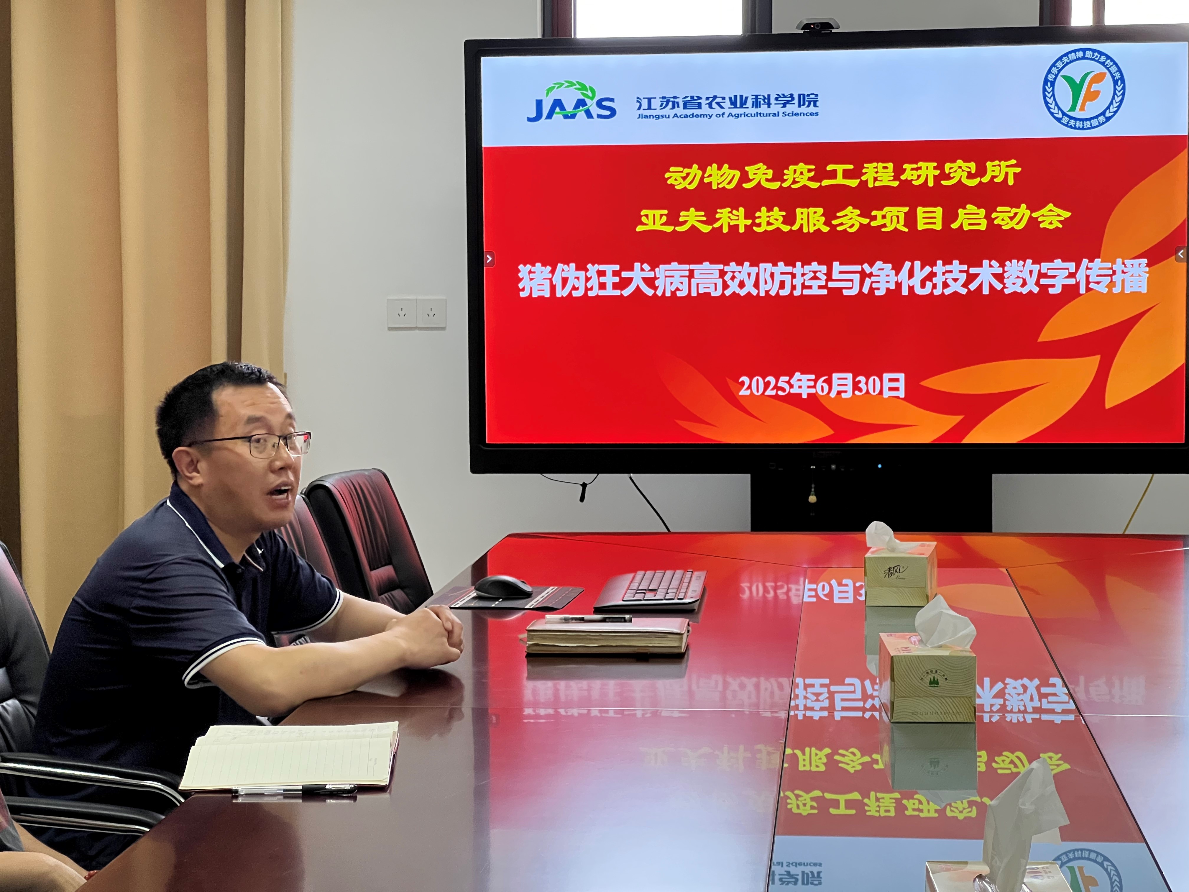 为推动猪伪狂犬病高效防控与净化工作的深入开展,强化科技成果的转化与推广应用,6月30日,江苏省农业科学院动物免疫工程研究所牵头组织的亚夫科技服务项目“猪伪狂犬病高效防控与净化技术数字传播”启动会在南京顺利召开。会议由项目负责人、免疫所王继春研究员主持,合作单位江苏农科传媒有限公司总经理吴爱民研究员、项目骨干等参加会议。