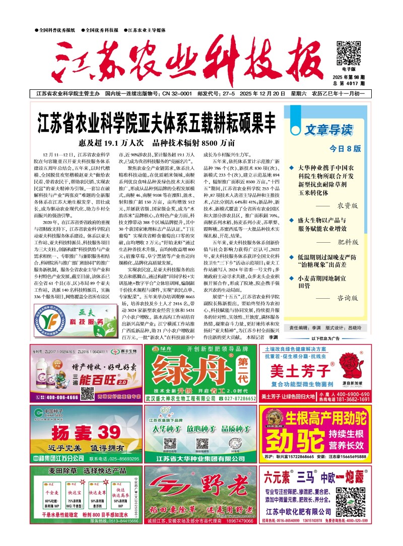 [江苏农业科技报]江苏省农业科学院亚夫体系五载耕耘硕果丰