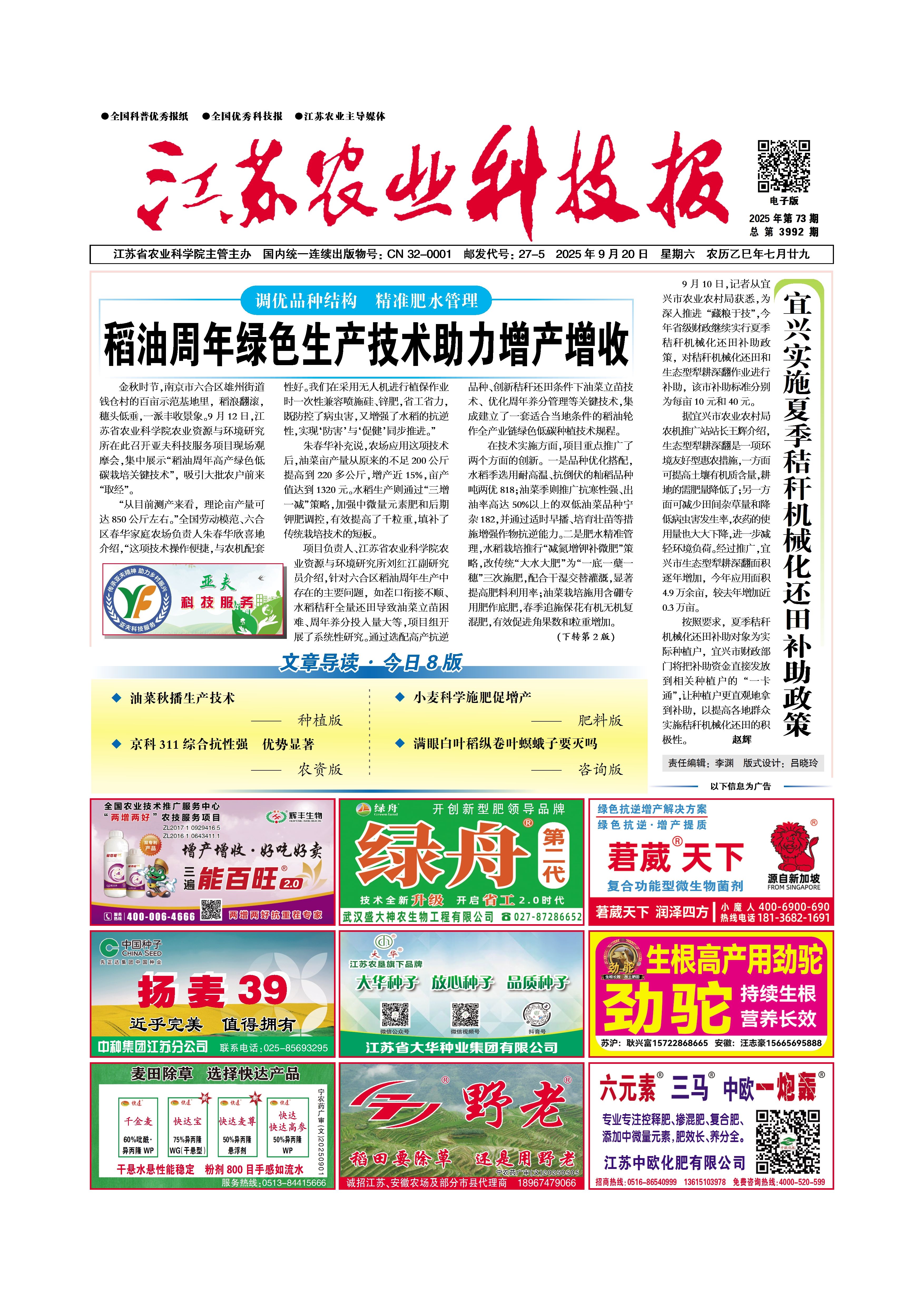 [江苏农业科技报]稻油周年绿色生产技术助力增产增收