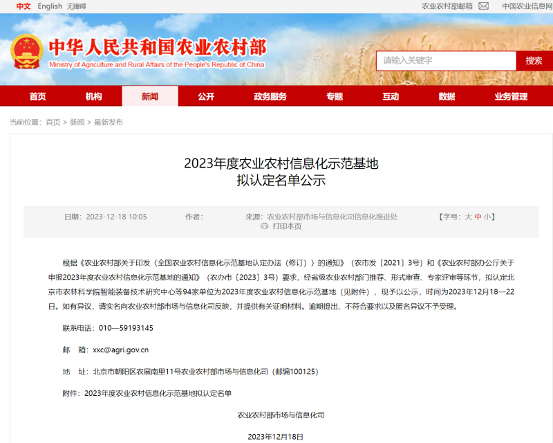 近日,农业农村部公布“2023年度农业农村信息化示范基地拟认定名单”,经材料申报、省农业农村厅推荐、形式审查、专家评审等环节,我院作为服务型示范单位首次获得认定。