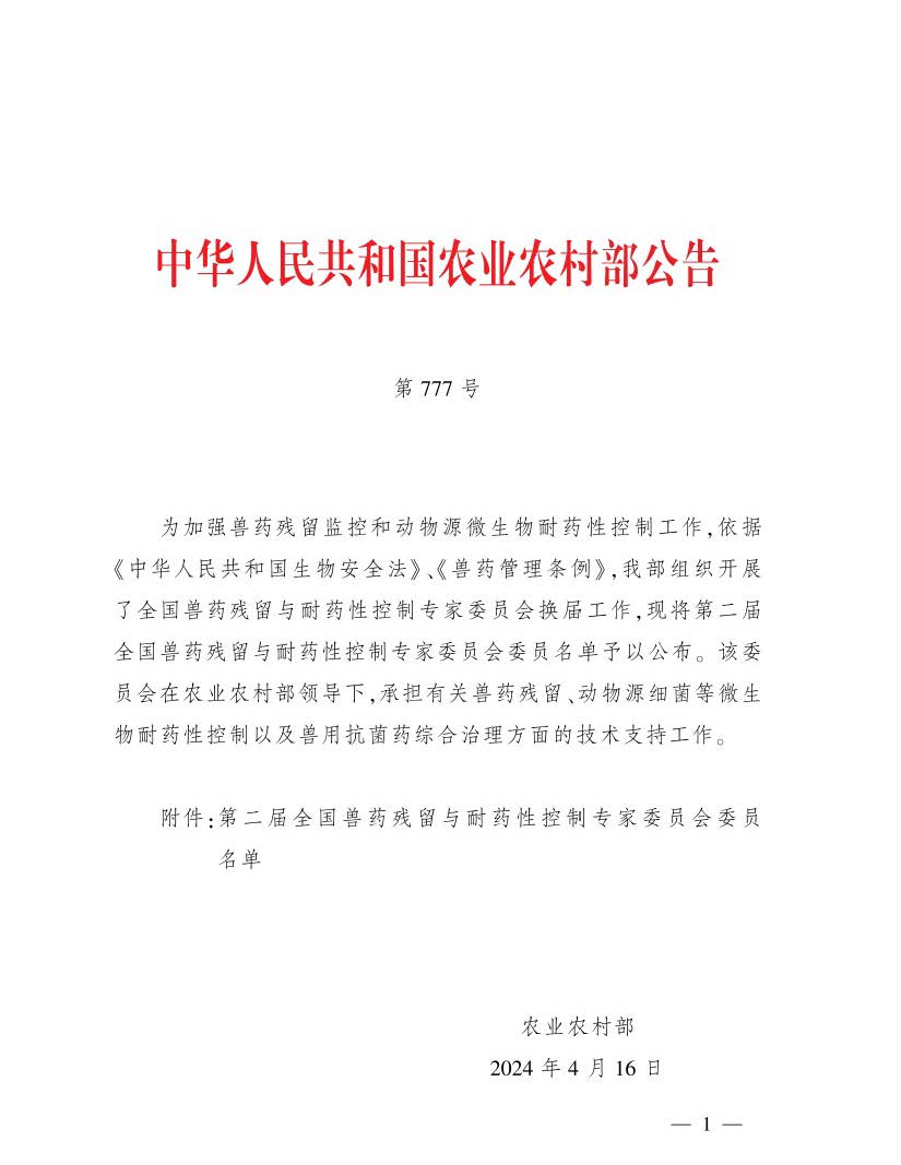 近日,为加强兽药残留监控和动物源微生物耐药性控制工作,依据《中华人民共和国生物安全法》《兽药管理条例》,农业农村部组建了第二届全国兽药残留与耐药性控制专家委员会,我院副院长王冉、质量安全所畜产品安全与营养创新团队魏瑞成研究员被聘为第二届全国兽药残留与耐药性控制专家委员会委员。