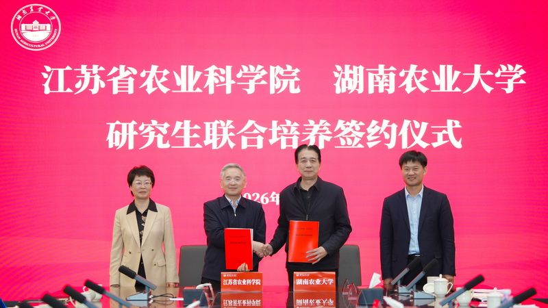 在湖南农业大学,党委副书记、校长唐文帮,党委副书记陈光辉陪同调研。唐文帮介绍了湖南农业大学的基本情况,并就学校薪酬体系建设、人才引育政策、教育科技人才一体化改革等方面工作举措作了说明。朱艳介绍了我院的基本情况,并对我院联合培养研究生的现状进行了说明,希望能以此次交流为契机深化双方合作对接,以人才共育为纽带,以项目合作为牵引,充分发挥各自资源与优势,推动农业科技创新与产业创新深度融合。会上,孙洪武和陈光辉代表双方签订研究生联合培养协议,协议将通过采取“联合指导、联合授课;联合考核、联合奖助;联合管理、联合建设”的培养模式,推进人才培养链与产业链对接融合、教育资源与科研资源紧密整合,培养具备高度创新意识、创新能力、科研素养、综合实践能力的高层次、高水平的创新型卓越农业人才。