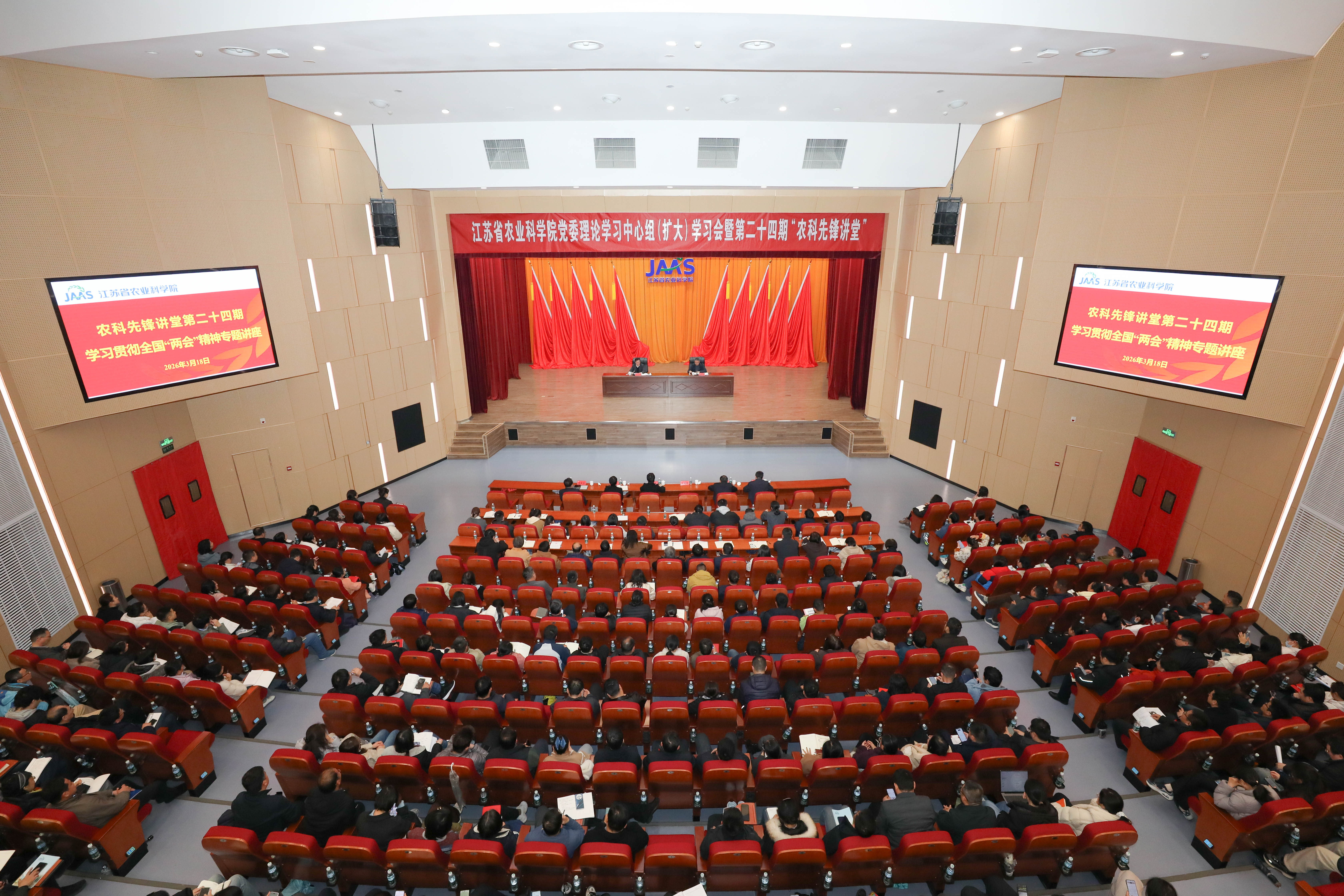 3月18日下午,院党委理论学习中心组在科技会堂举办2026年第3次扩大学习会暨第二十四期“农科先锋讲堂”,专题学习贯彻2026年全国“两会”精神。院党委书记王克华主持会议并讲话,全国人大代表、江苏里下河地区农业科学研究所高德荣研究员作专题报告。院领导、党委委员,处所级领导干部、科研团队负责人,民主党派及统战团体负责人,党支部书记、党员代表等400余人参加会议。