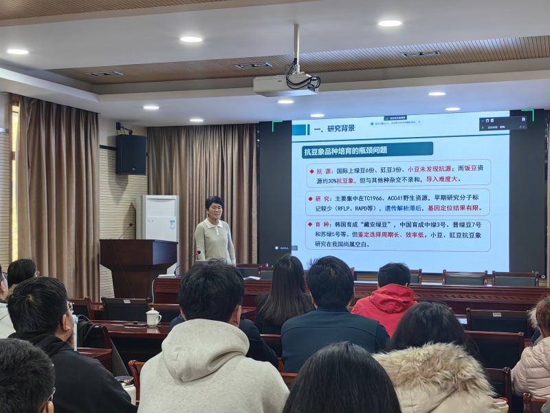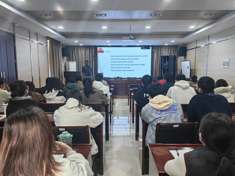 会上,田静研究员作了题为“食用豆抗豆象遗传解析、种质创制与应用”的报告,对绿豆、豇豆等食用豆抗豆象基因挖掘和新品种创制等方面作了介绍。随后,Sivakumar Paramsivam副教授作了题为“Recent advancement in Vigna spp. regeneration: An update”的报告,对印度泰米尔纳德农业状况、泰米尔纳德农业大学选育的农作物新品种、豇豆再生体系构建等方面作了介绍。与会人员就自己感兴趣的问题与报告专家开展了交流与讨论,在食用豆遗传育种及基因发掘等领域进行了深入交流。