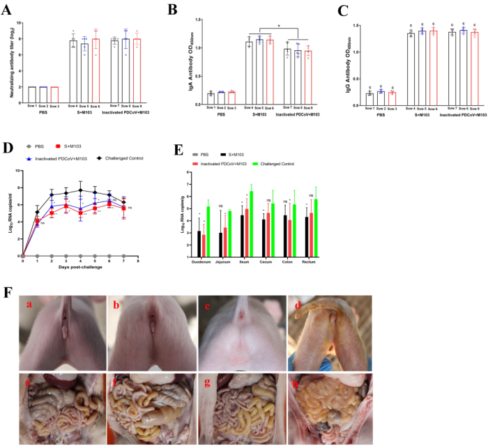 PDCoV临床上主要危害新生仔猪,为了证实新型PDCoV S蛋白亚单位疫苗的被动免疫保护效果,研究人员将该亚单位疫苗免疫怀孕母猪,新生仔猪吸食5天母乳后攻毒,同时也免疫PDCoV灭活疫苗做为阳性对照、免疫PBS做阴性对照。通过检测母乳和血清的中和抗体发现,仔猪出生当天母乳/血清中和抗体最高,分别达1:128和1:256以上,随后逐渐降低,同时母乳中检测到高水平的IgA抗体。仔猪攻毒后发现,S亚单位疫苗免疫组无仔猪腹泻,PDCoV灭活疫苗有2头仔猪发生轻微腹泻,攻毒对照组5头仔猪均发生持续性严重腹泻;免疫组肛拭子排毒水平、肠道组织病毒载量、剖检病变和显微病变均显著低于攻毒对照组(P<0.05)。综上所述,本研究研制的新型PDCoV S蛋白亚单位疫苗具有较好的主动免疫和被动免疫保护效果,可作为预防控制PDCoV的候选疫苗。