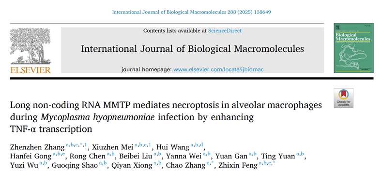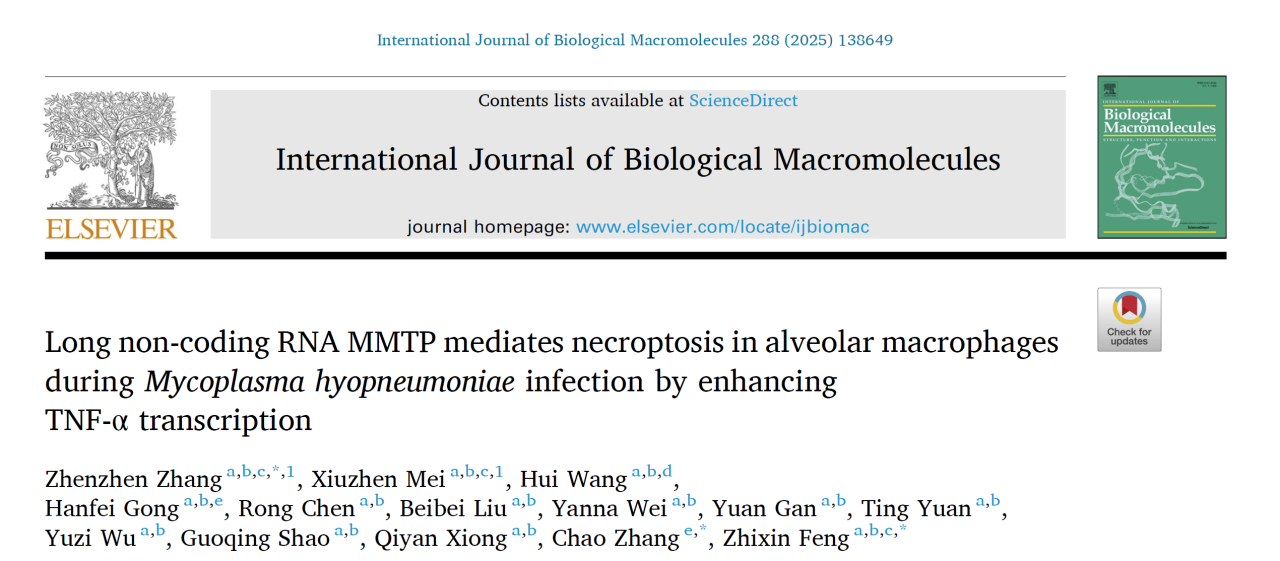 近日,兽医所动物支原体创新团队在国际学术期刊“International Journal of Biological Macromolecules”(中科院一区Top期刊,影响因子7.7)在线发表了题为“Long non-coding RNA MMTP mediates necroptosis in alveolar macrophages during Mycoplasma hyopneumoniae infection by enhancing TNF-α transcription”的研究论文。研究以肺泡巨噬细胞为研究对象,阐明肺炎支原体诱导猪肺泡巨噬细胞坏死性凋亡的分子机制,重点研究lncRNA-MMTP在调节TNF-α转录和程序性坏死途径激活中的作用。