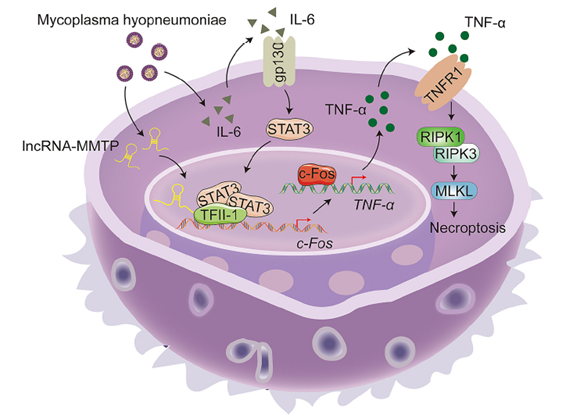 该研究鉴定了一种新的长链非编码RNA,命名为lncRNA-MMTP,它在Mycoplasma hyopneumoniae感染过程中显著上调,并在猪肺泡巨噬细胞中发挥重要作用。研究表明,lncRNA-MMTP在Mycoplasma hyopneumoniae引发的肺泡巨噬细胞坏死性凋亡中起着至关重要的作用。lncRNA-MMTP促进转录因子TFII-I和STAT3的招募,从而增强c-Fos启动子活性。该增强作用上调了TNF-α的转录,进而诱导肺泡巨噬细胞发生坏死性凋亡。该研究揭示了Mycoplasma hyopneumoniae引发肺部炎症的新分子机制,并为病原感染后肺部炎症的干预提供了新的靶点。