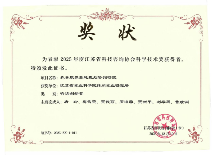12月16日,江苏省科技咨询协会颁布了2025年度江苏省科技咨询协会科学技术奖,休闲所农业景观与文化研究团队承担的《森林康养基地规划咨询研究》项目荣获咨询创新奖,这也是该团队继2021年、2022年后第三次获得此荣誉。