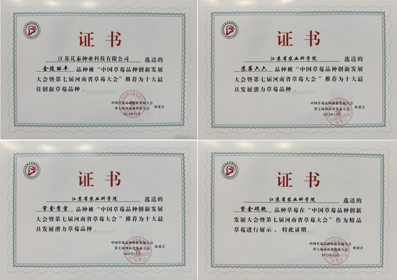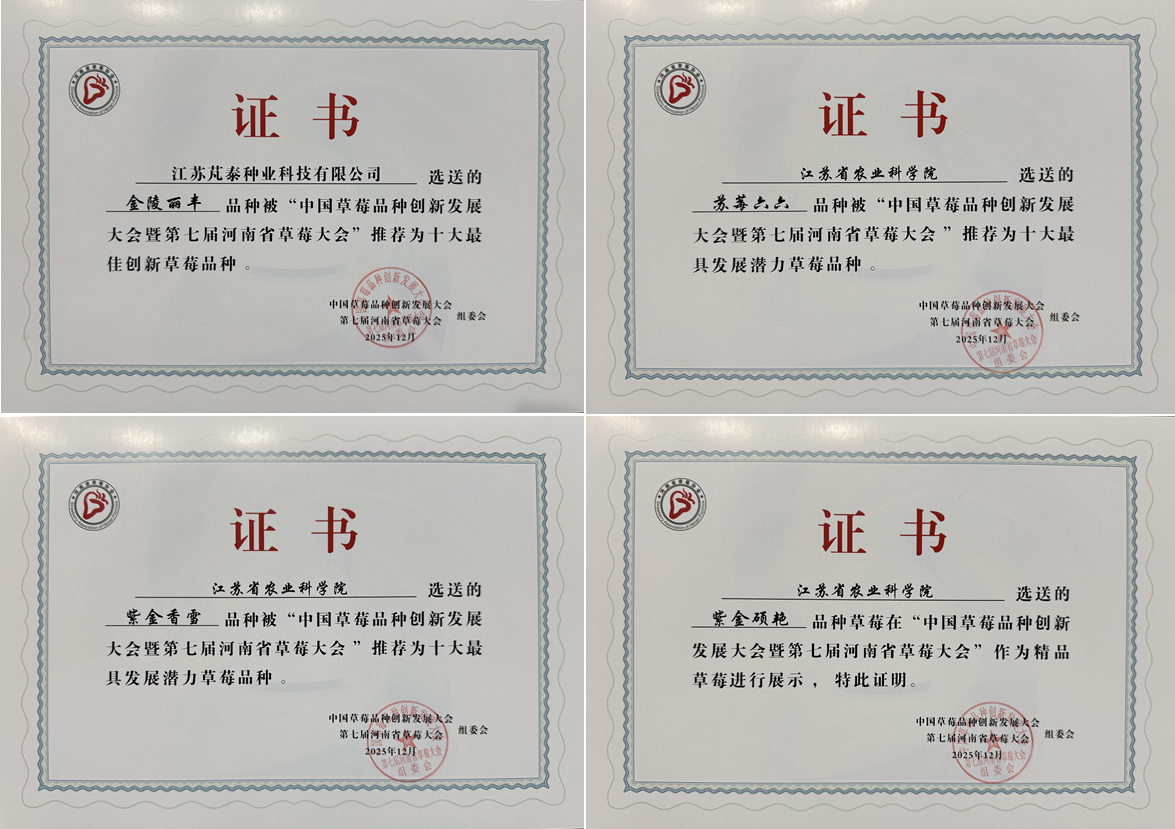 经会务组及大众网友双重遴选,最终产生“十大最佳创新草莓品种”和“十大最具发展潜力草莓品种”。我院果树所选育的‘金陵丽丰’(早熟丰产)被推荐为“十大最佳创新草莓品种”,‘苏莓66’(极早熟优质)‘紫金香雪’(早熟白果)被推荐为“十大最具发展潜力草莓品种”。据悉,河南省草莓主栽品种以我院选育的‘宁玉’等极早熟品种为主。近年来,我院选育的‘金陵丽丰’‘紫金硕艳’等新品种持续发力,在本次大会鲜果品鉴环节获得行业广泛认可,集中展示了我院在草莓育种领域的硬核实力。