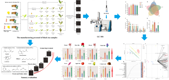 团队以特定波段黄光(585-590nm)萎凋为核心,在红茶加工中创新研发出黄光+高温组合萎凋(HY)技术。经多组对照试验与系统分析,HY技术实现了红茶香气的定向优化,显著增强其花香与甜果香特征。通过GC-MS与代谢分析进一步揭示,黄光与高温可协同调控萜类合成、脂肪酸降解及氨基酸代谢通路,促使花香物质(反式-β-紫罗兰酮、芳樟醇、香叶醇、壬醛)与甜果香物质(苯乙醛、3-甲基丁醛、二甲硫醚)大幅富集,富集倍数达3.2-9.8倍,从而有效提升红茶香气品质,为高香茶叶生产及季节性香气缺陷的改善提供了理论依据与实践基础。