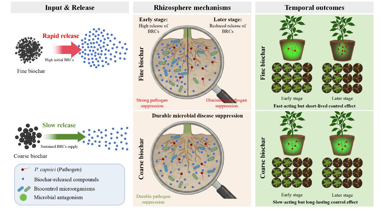 研究团队基于“生物炭可脱离物(BRCs)释放动力学”视角,首次阐明了生物炭粒径如何通过调节BRCs释放速率,进而动态塑造土壤根际微生物的抑病功能。研究发现,细粒径生物炭具有极强的“速效性”,能通过早期爆发式释放BRCs迅速改善土壤微生物性状,诱导木霉、假单胞菌等有益微生物种群快速增长,在种植初期强力压制辣椒疫病病原菌丰度并维持较低病情指数;而粗粒径生物炭则凭借其优异的“缓释”模式持续提升土壤微生物抑病性,展现出更持久的土壤抑病潜力。